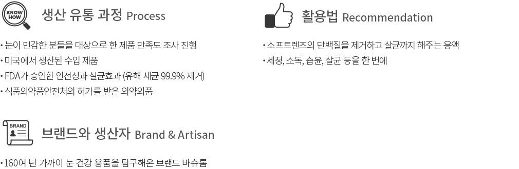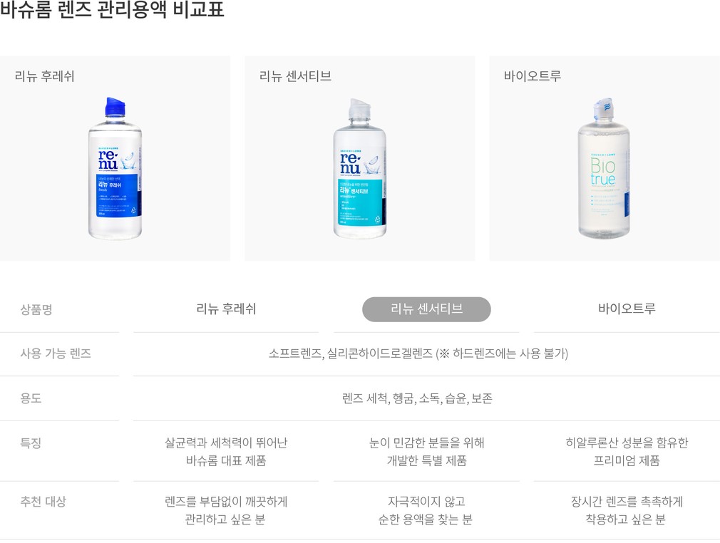 ・특징 : 소프트렌즈(실리콘하이드로겔렌즈 포함)를 세척 및 보관할 수 있는 다목적 관리용액이에요. 습윤성에 각별히 신경써 만든 제품인 만큼 눈이 쉽게 건조해지는 분들이나 장시간 렌즈를 착용하는 분들이 사용하면 좋습니다.