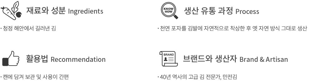 ・유의사항 : 이 제품은 미리 간을 한 조미김이에요. 간이 되어 있지 않은 김을 원하신다면 무가미 제품을 찾아주세요.