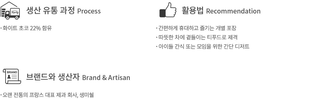 1905년에 설립되어 프랑스인들의 꾸준한 사랑을 받고 있는 제과회사 생미쉘. 프랑스 서쪽 해안가 작은 시골 마을에서 요리사 남편이 특별한 레시피로 구워낸 쿠키를 아내가 판매한 것이 그 시작이었다고 해요. 컬리는 생미쉘의 다양한 상품 중에서도 화이트 초콜릿을 듬뿍 넣고 구운 화이트 브라우니를 가져왔어요. 한입 베어 물면 촉촉한 식감은 물론, 화이트 초콜릿 특유의 은은한 달달함이 느껴지지요. 개별로 포장되어 있는 상품이니 가방에 쏙 넣고 다니며 간편하게 즐겨 보세요.