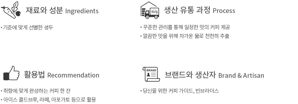 ・특징 : 고소하면서도 진한 견과류의 향, 묵직한 맛이 제대로 느껴져요. 입에 한 모금 머금으면 다크초콜릿처럼 쌉싸름하면서도 깊은 달콤함, 캐러멜의 풍미가 함께 남는답니다.