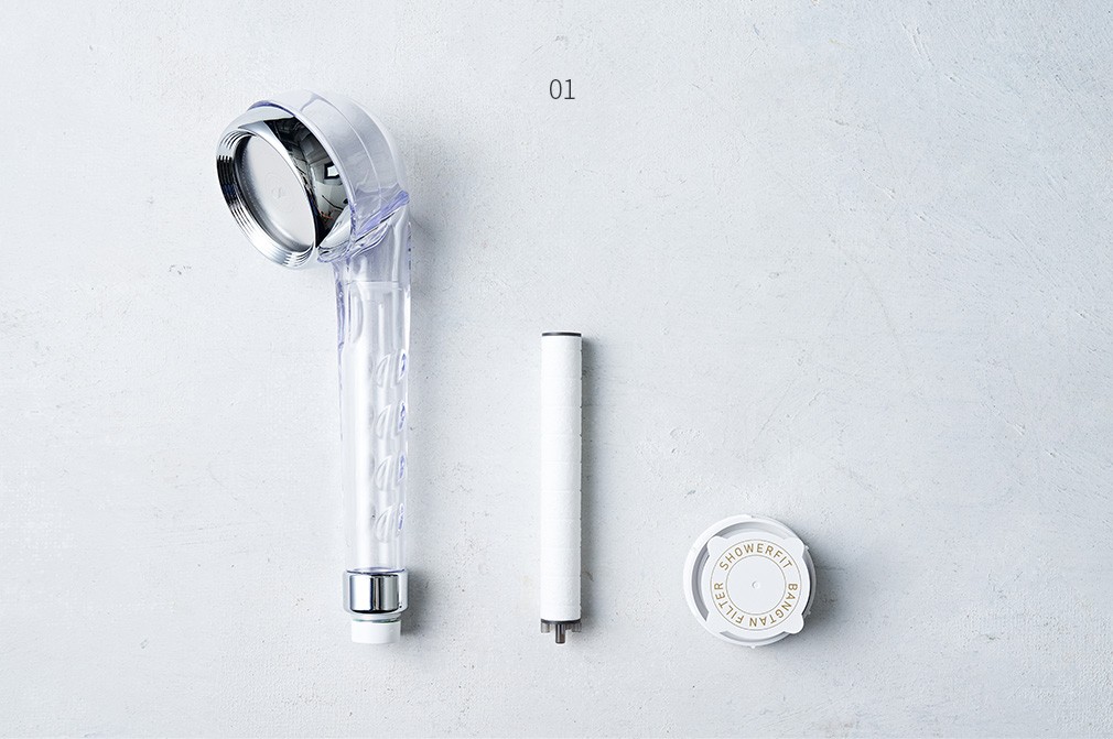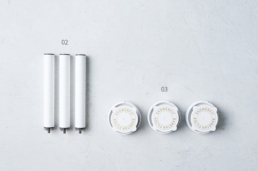 01. 필터 샤워기 세트 ・구성 : ①샤워기 헤드, ②1차 필터, ③2차 필터