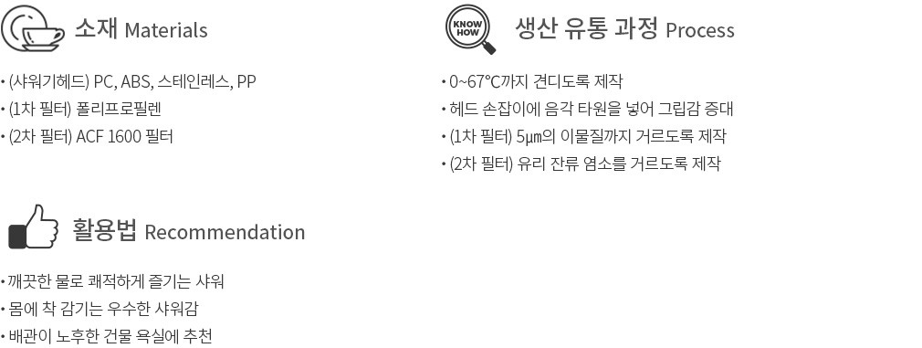 ・특징 : 강화 플라스틱 소재로 내구성이 좋고, 살수판에 홈이 촘촘히 나서 파스스 부서지는 기분좋은 물줄기를 만들어요.
