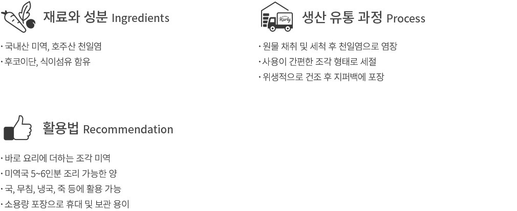구입 전 참고하세요 ・미역을 잘게 잘라서 건조한 제품으로, 별도로 불리는 과정 없이 씻거나 끓이면 먹기 좋은 크기로 불어납니다.