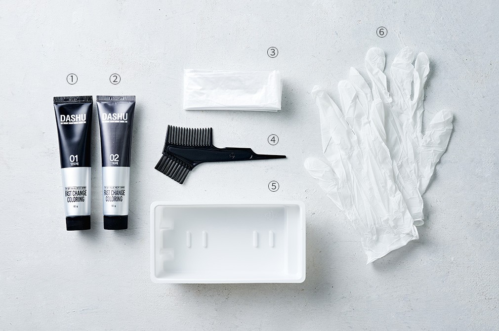 ・구성 : ①1제 염모제(60g), ②2제 산화제(60g), ③비닐가운 1매, ④염색용 빗, ⑤염색 트레이, ⑥비닐장갑 2매