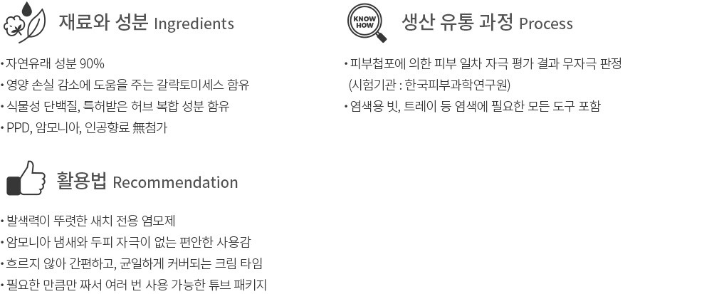 구매 전 참고하세요 ・새치 전용 제품으로, 멋내기용 염색제에 비해 발색력이 강해요.