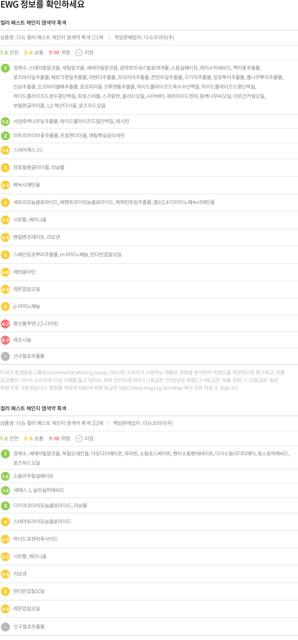 컬리는 EWG로부터 보통, 위험 등급을 받은 성분이라 하더라도 숨기지 않고 정직하게 공개합니다. 더불어 우려되는 성분에 대한 정보를 함께 제공해 드리오니 구입 전 반드시 확인해 주세요.
