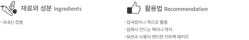 밥상에 영양과 재미를 더해줄 잡곡을 소개할게요. 이 땅에서 자란 국내산 찹쌀이랍니다. 찹쌀은 밥을 짓는 멥쌀과 어깨를 나란히 하는 대표적인 곡물이죠. 정성을 담아 찹쌀죽을 끓이기도 하고, 각양각색의 떡을 짓거나 약식, 식혜, 고추장을 만들 때 필수 재료였죠. 밥에 찰기를 더하고 싶을 때나, 집에서 특별한 날을 맞아 약식 만들기나 떡 만들기에 도전할 때 장바구니에 담아보세요.