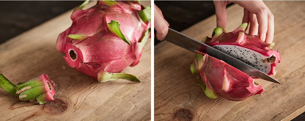 손질법 1. 용과의 위쪽 돌기 부분을 칼로 잘라주세요.