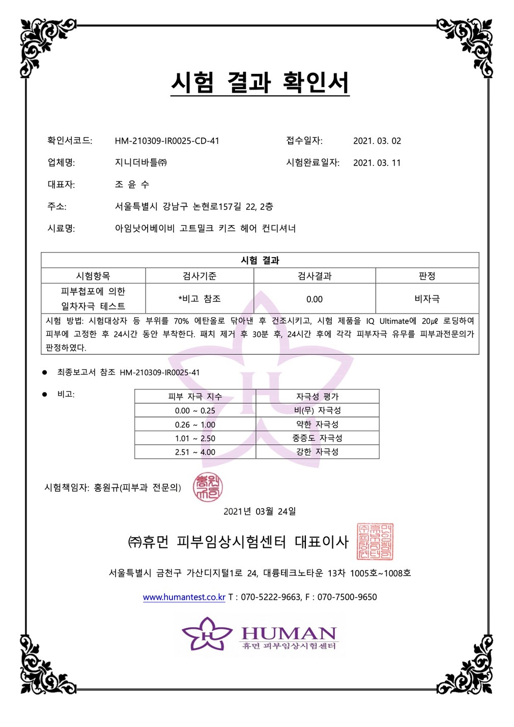 성적서를 확인하세요 ・시험 기관 : (주)휴먼 피부임상시험센터