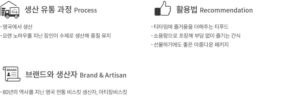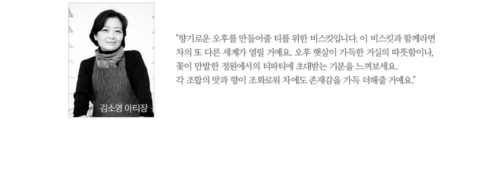 ・특징 : 신선한 레몬 향과 스파이시하면서도 따뜻한 생강의 향이 은은하게 풍깁니다. 자스민 차와 잘 어울리는 시그니처 비스킷입니다.