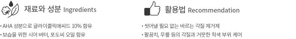 ・특징 : AHA 성분이 10% 첨가되어 건조한 부위를 매끄럽게 만들어줍니다. 거친 스크럽 알갱이나 인공 향 등이 첨가되지 않아 자극에 민감한 피부에도 사용할 수 있어요.