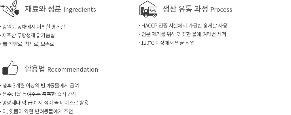 주의 사항을 확인하세요 ・고단백 간식이에요. 노령이거나 평소 신장이 약한 반려동물이라면 급여 전 전문가와의 상담을 권해드려요.