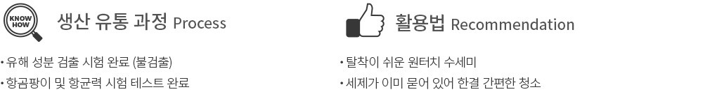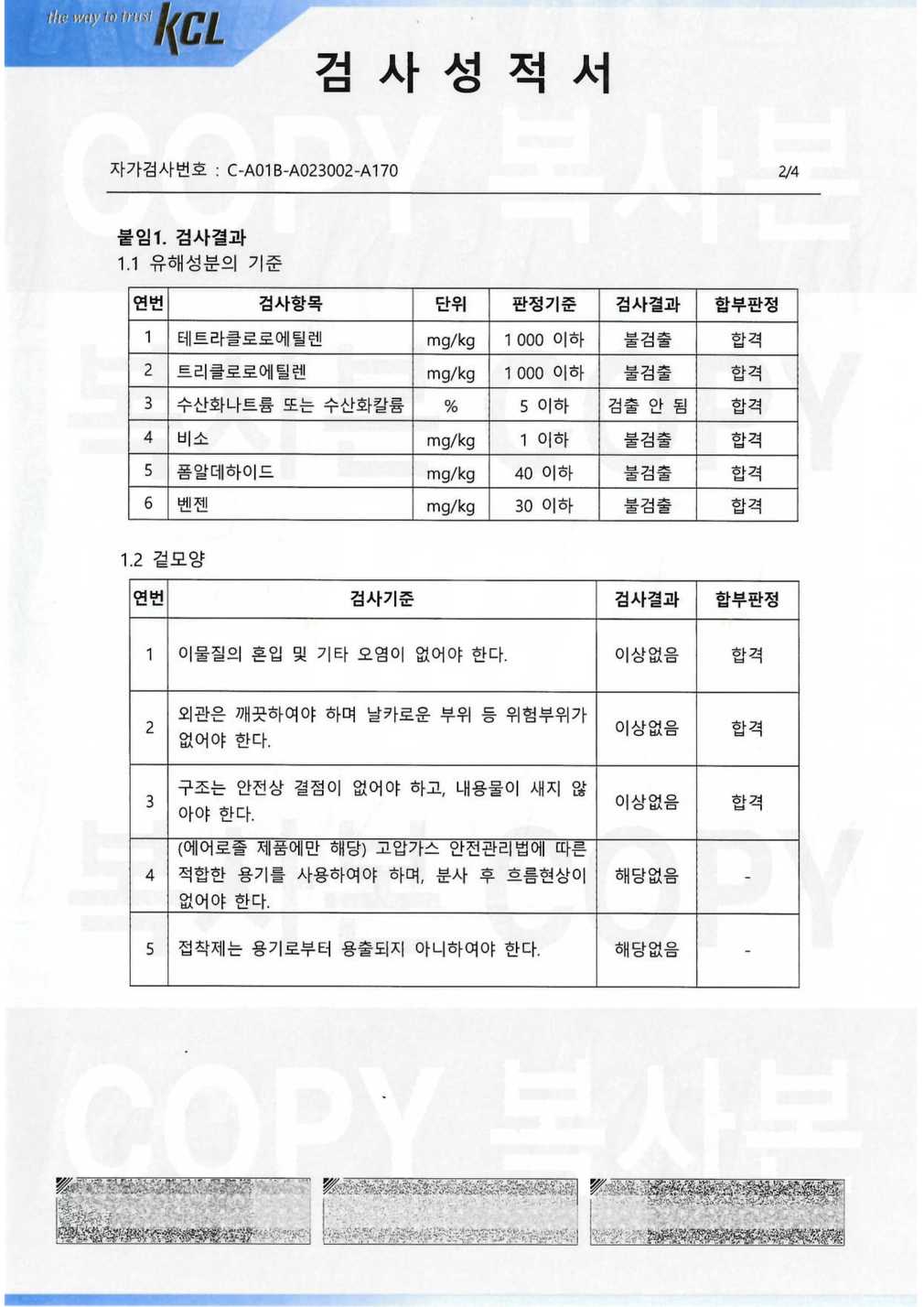 ・KCL(한국건설생활환경시험연구원)에서 진행한 시험에서도 유해성분(테트라클로로에틸렌, 트리클로로에틸렌, 수산화나트륨 또는 수산화칼륨, 비소, 폼알데하이드, 벤젠)이 검출되지 않았습니다.