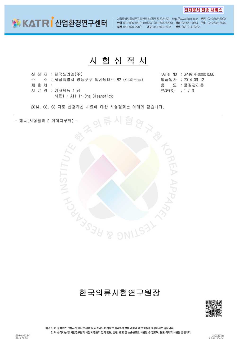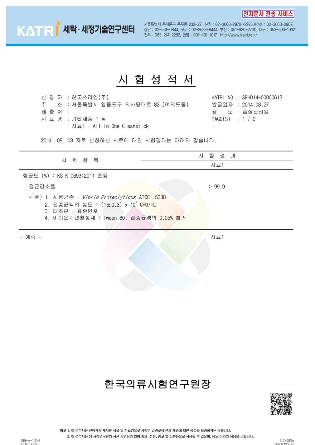 성적서를 확인하세요 ・올인원 변기용 크린스틱 리필은 KATRI(한국의류시험연구원)의 시험 결과 비브리오 균주에 대한 살균감소율이 99.9%로 판정되었어요.