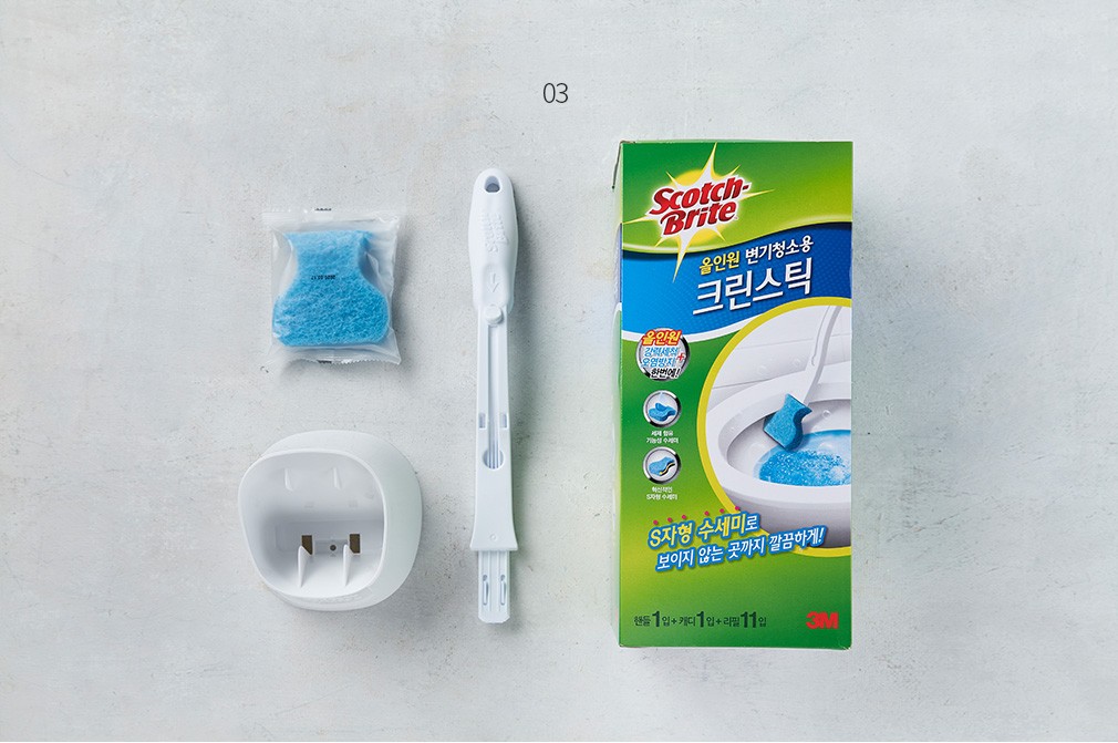 03. 올인원 변기청소 크린스틱 핸들+보관캐디+리필 11입 ・구성 : ①크린스틱 핸들 1개입, ②보관캐디 1개입, ③리필 11개입