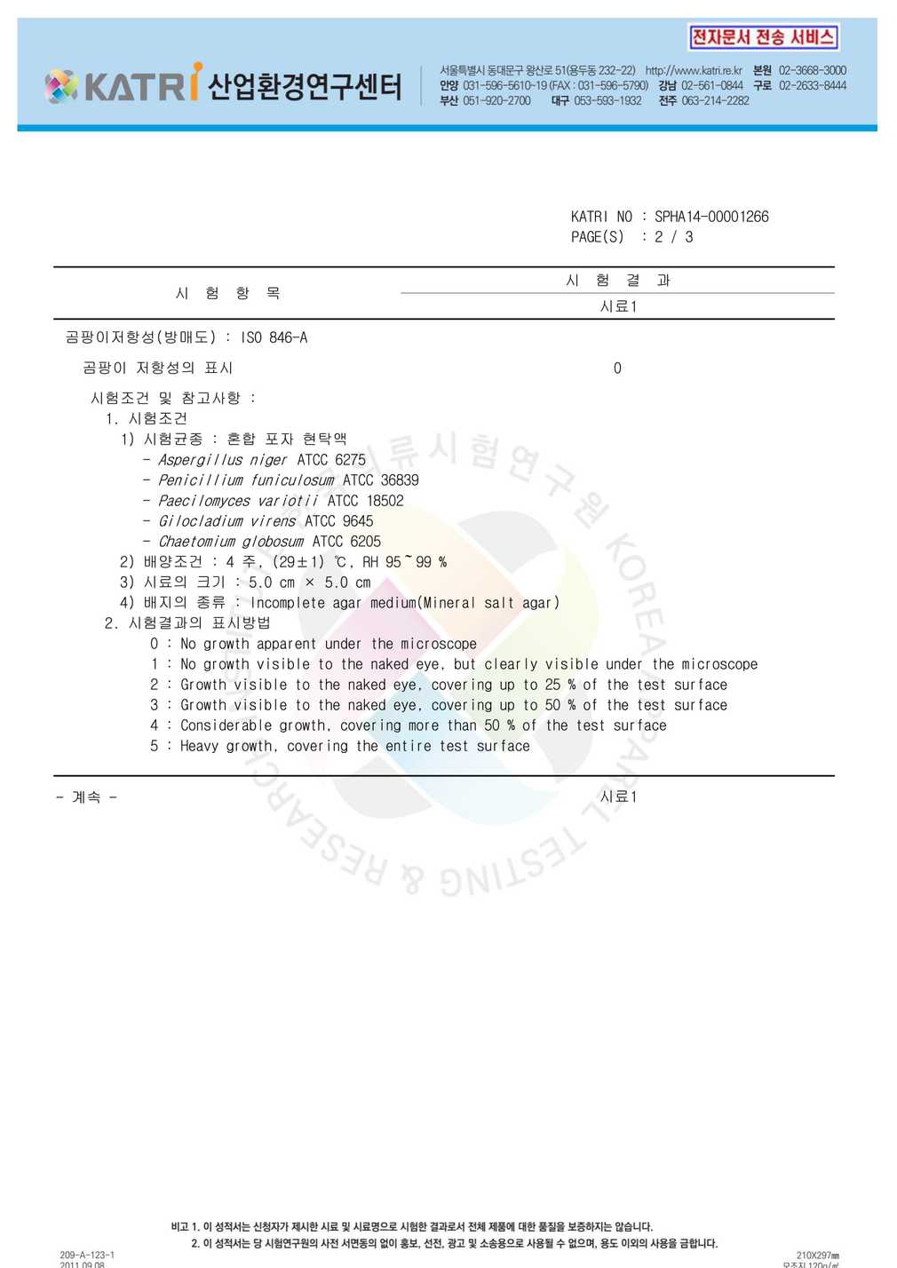 ・또한 곰팡이 저항성 실험 결과 현미경 관찰 실험에서 곰팡이(Aspergillus niger, Penicillium funiculosum, Paecilomyces variotii, Gilocladium virens, Chaetomium globosum)생육이 인지되지 않아 항곰팡이성 제품임이 확인되었습니다.