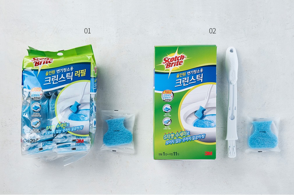 변기 청소는 어떻게 해도 참 찜찜하고 마음에 걸리죠. 깨끗하게 닦였는지, 혹시나 빠트린 부분은 없는지 걱정스러울 때도 많은데요. 3M의 올인원 변기 청소 크린스틱은 이런 걱정을 말끔하게 해결하는 제품입니다. 스틱 앞에 수세미를 끼우고 물에 넣기만 해도, 수세미에 담긴 세제가 스며나와 이물질과 물때는 물론 균까지 99.9% 제거해줘요. 수세미 자체의 모양에 굴곡이 있어 안쪽까지 골고루 닦을 수 있는 건 덤이지요. 다 사용한 후에는 버튼을 앞으로 밀기만 해도 스틱과 수세미가 쉽게 분리되니 안심하고 사용하세요.
