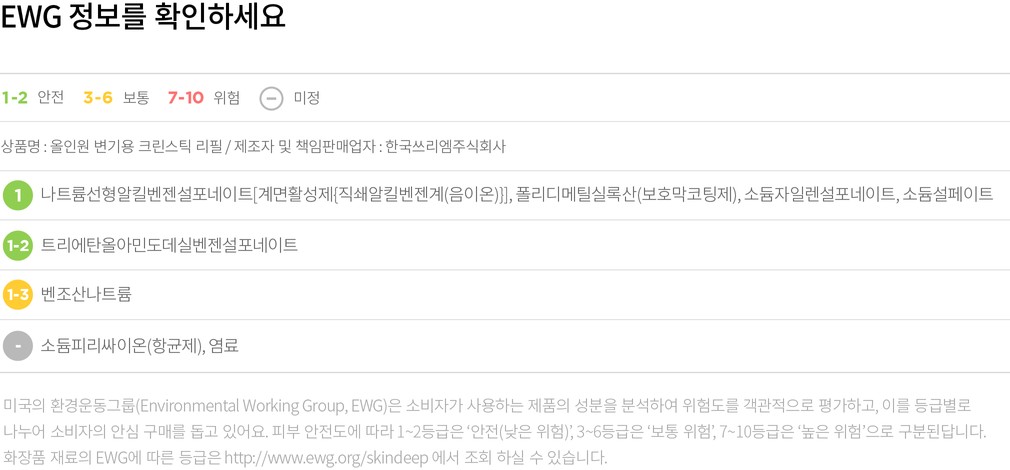 EWG에 대한 컬리의 생각 컬리는 화장품, 샴푸, 치약, 세제 등 우리의 인체에 닿는 리빙 제품의 전성분을 공개하고 성분의 위험 정도를 EWG 기준에 따라 1~10 숫자로 안내하고 있습니다. EWG가 세계적으로 널리 사용되는 신뢰할 수 있는 척도인 것은 맞지만, 상품의 안전성을 증명하는 절대적인 기준은 아니에요. EWG로부터 좋지 못한 평가를 받은 성분에 대해 전문가와 유관기관은 '권고 기준치를 지켜 사용할 경우 무해하다'고 평가하기도 합니다. 이에 컬리는 EWG 등급과 인터넷에 떠도는 단편적인 정보에만 의존하지 않고 식품의약품안전처, 에코서트(ECOCERT), 미국식품의약국(FDA), 미국화장품원료검토위원회(CIR)등 공신력 있는 인증기관의 의견을 참고하여 유해성 여부를 꼼꼼하게 따져 보고 있습니다.