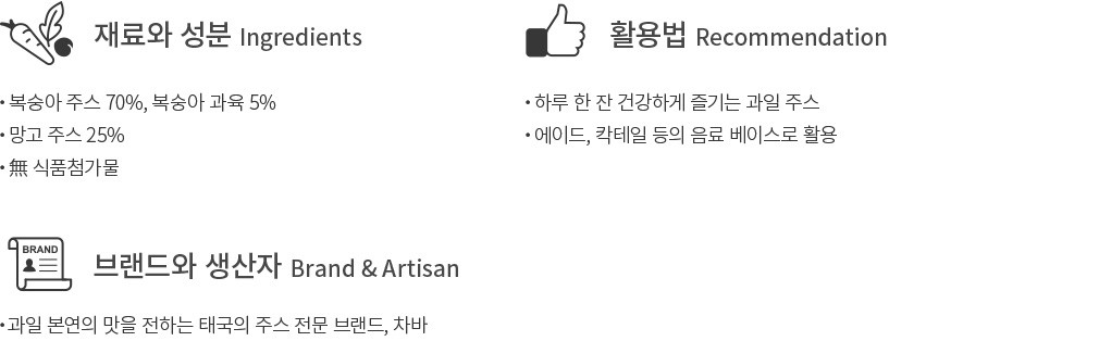 20년 전통의 태국 과일 음료 전문 브랜드, 차바의 복숭아 망고 주스를 만나 보세요. 부드럽고 달콤한 복숭아 주스 70%에 망고 주스 25%를 배합해 더욱 향긋하고도 풍성한 맛을 완성시켰어요. 과일 본연의 좋은 성분들을 그대로 섭취할 수 있도록 첨가물 없이 깔끔하게 담아냈지요. 하루 한 잔, 달콤한 맛을 온전히 즐기기에도 좋고요. 에이드 또는 칵테일의 베이스로 활용해도 그만이랍니다.