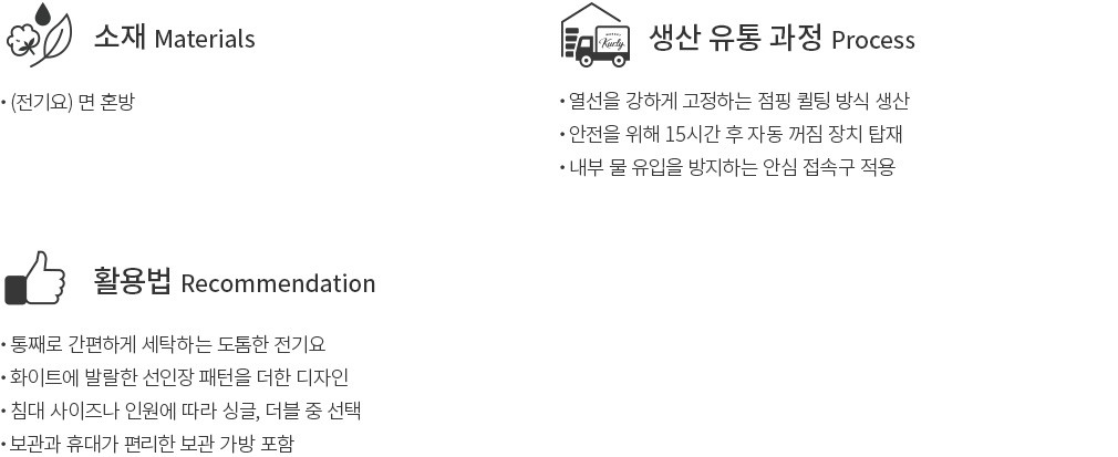 사용 시 참고하세요 ・전기요를 장시간 사용할 경우 저온 또는 고온 화상을 입을 수 있으니 주의하세요.