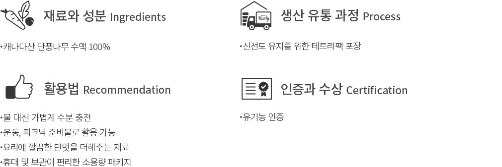 활용법 ・식사나 운동 중에 물 대신 메이플워터를 즐겨보세요. 수분 충전을 더욱 맛있고 가볍게 할 수 있답니다.