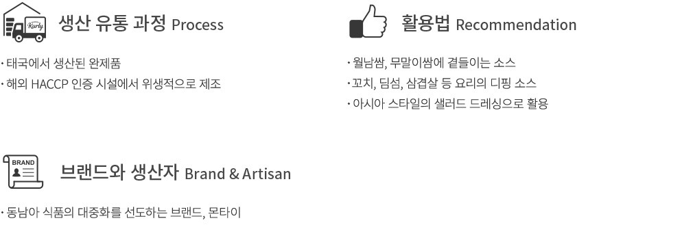 ・특징 : 입에 착 감기는 진한 감칠맛을 지닌 소스에요. 짭짤한 멸치액과 새콤한 레몬, 매콤한 칠리가 조화롭게 어울려요.