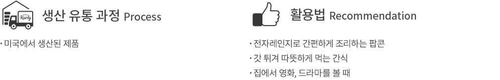 ・유의사항 : 갓 튀긴 팝콘은 매우 뜨겁습니다. 봉지를 거꾸로 들면 뜨거운 오일이 흐를 수 있으니 주의하세요.