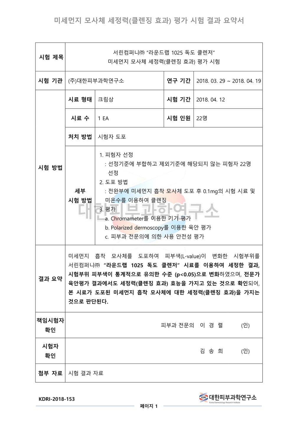 ②(주)대한피부과학연구소 : 미세먼지 흡착 모사체에 대한 세정력을 가지며, 이로 인해 미세먼지 세정에 도움을 줄 수 있는 것으로 판단