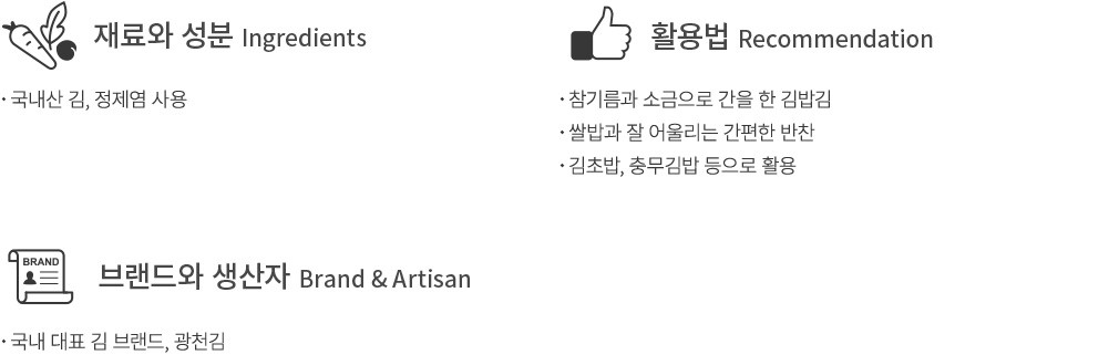 ・특징 : 참기름과 정제염으로 간을 한 조미 김밥김으로, 따로 간을 하지 않고 바로 김밥을 만들 수 있어 간편해요.