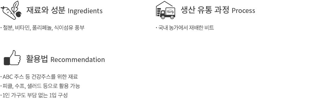 개수와 중량을 확인하세요 ・비트 1개를 담아 보내드려요. 신선식품 특성상 원물마다 크기와 형태가 조금씩 다를 수 있으니 구매 전 참고하세요.