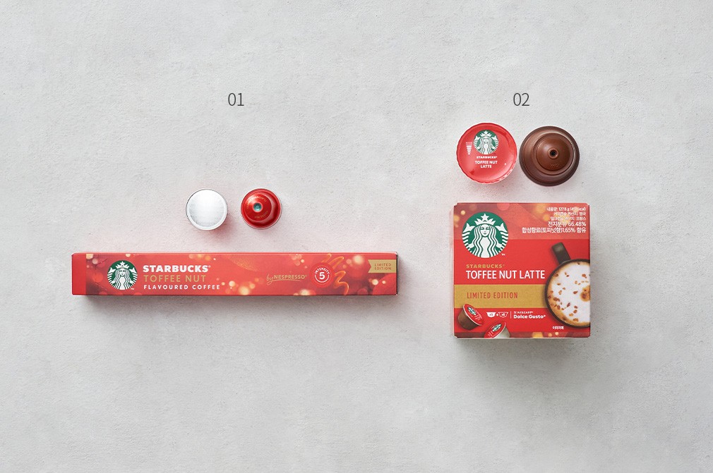 - 토피넛라테 by 네스카페 돌체구스토 : 우유 함유 대두를 원료로 사용한 제품과 동일한 생산설비에서 제조 - 홀리데이 파우더커피 (토피넛향 라테) : 우유, 밀 함유