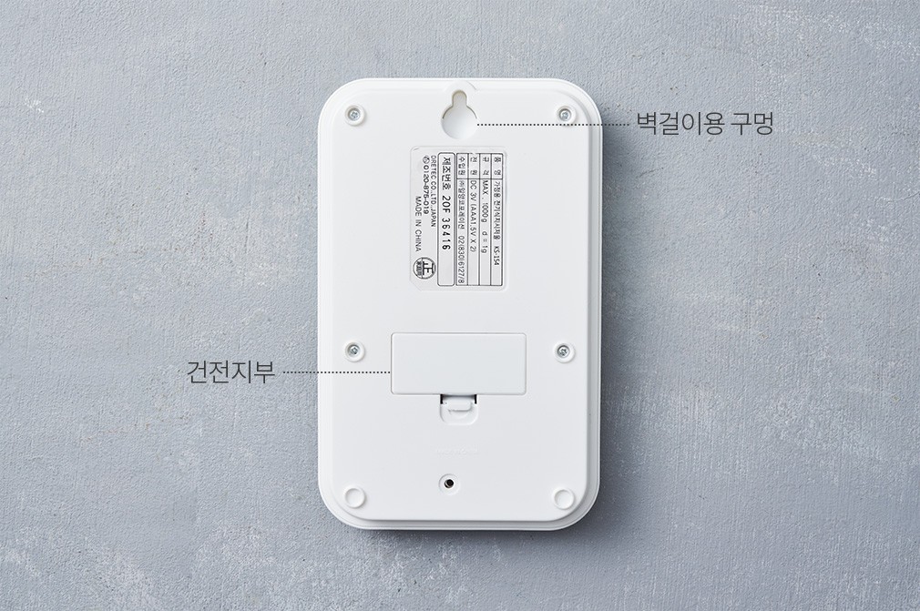 뒷면 안내 ・벽걸이용 구멍 : 주방 벽걸이 고리에 저울을 걸어둘 수 있도록 구멍을 추가했어요. 보관 시 사용하세요.