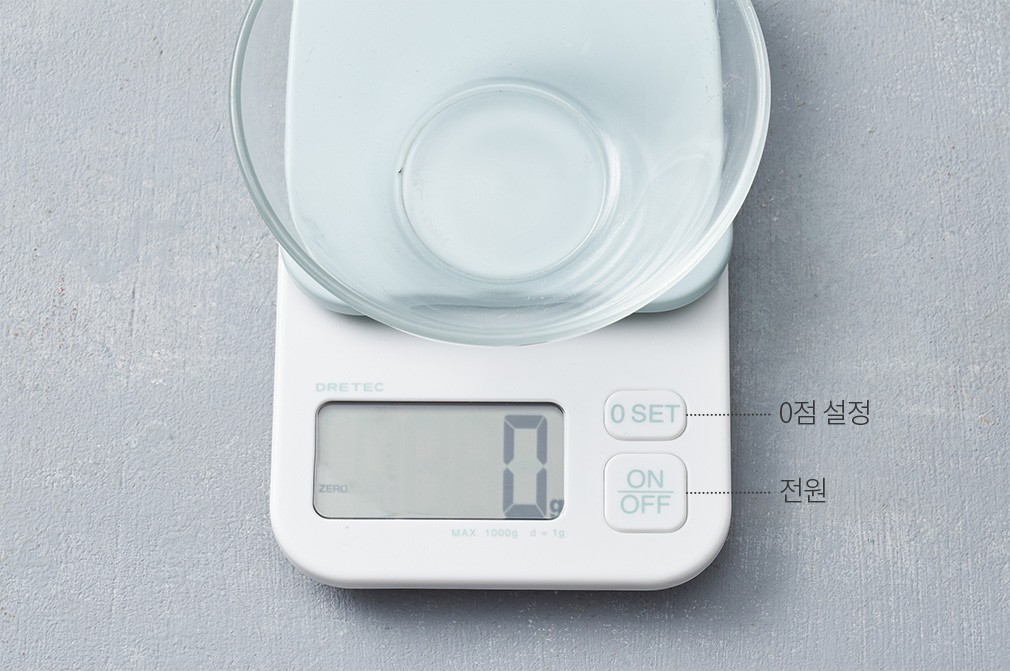 3. 디스플레이에 0이 표시되면 계량할 재료를 용기에 올려 무게를 측정하세요.