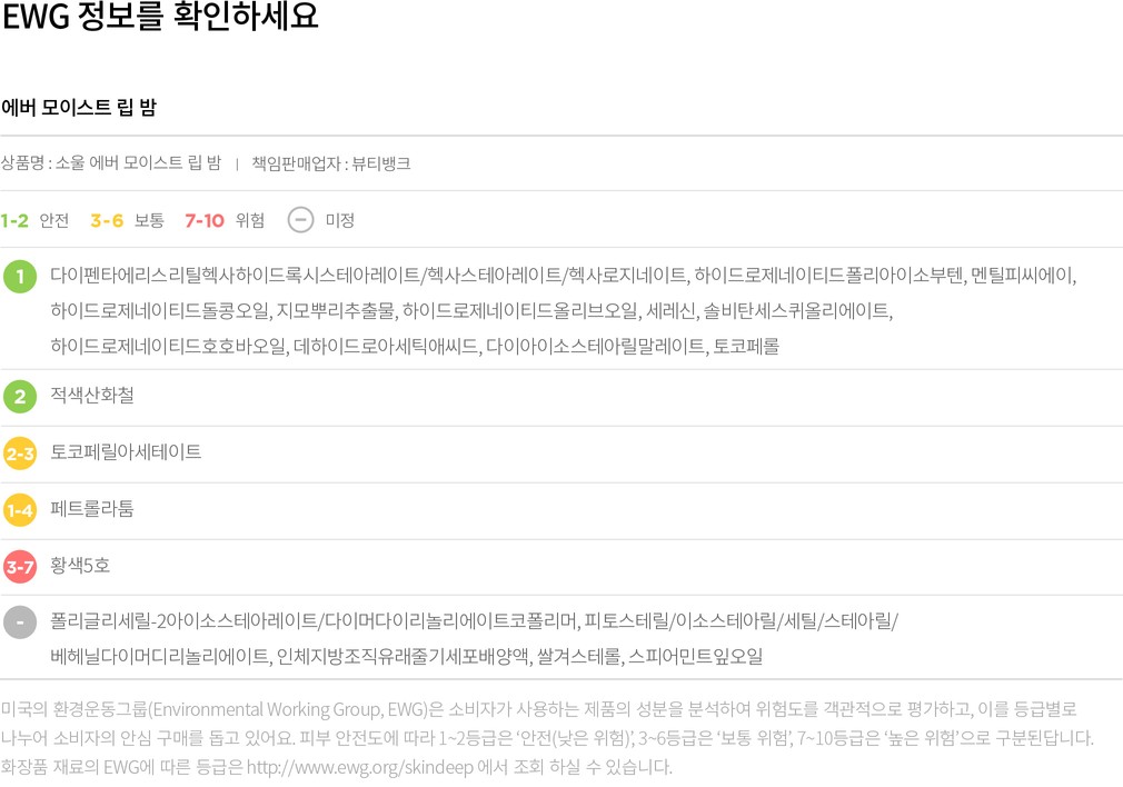 컬리는 EWG로부터 보통, 위험 등급을 받은 성분이라 하더라도 숨기지 않고 정직하게 공개합니다. 더불어 우려되는 성분에 대한 정보를 함께 제공해 드리오니 구입 전 반드시 확인해 주세요.