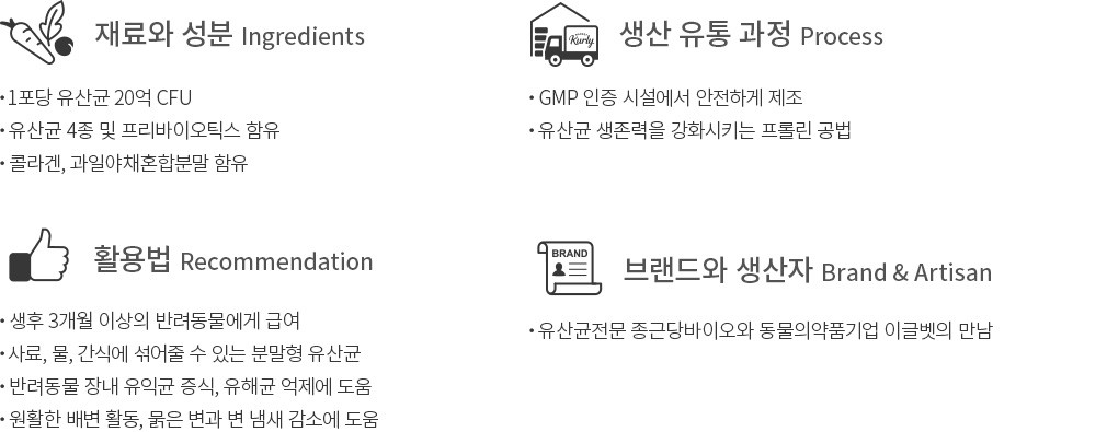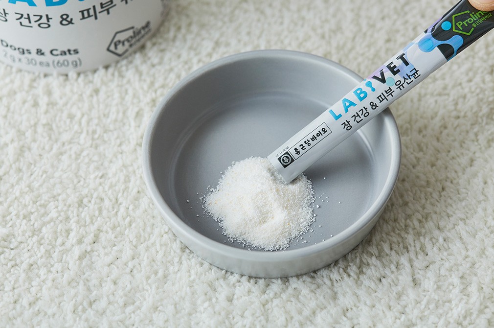 반려동물이 그저 맛있는 음식을 건강하게 소화하고 문제없이 배변 활동을 하기만 해도 참 뿌듯하지요. 강아지와 고양이 모두에게 급여할 수 있는 유산균을 소개할게요. 사람이 먹는 유산균을 만드는 종근당바이오가 연구 개발에 참여해 더욱 믿을 수 있는 제품입니다. 보장균수가 20억에 달하고, 유산균의 먹이가 되는 프리바이오틱스도 함께 담겨있는 신바이오틱스예요. 사르르 녹는 분말 타입이니 좋아하는 간식이나 주식 캔에 섞어서 간편하게 급여해보세요.