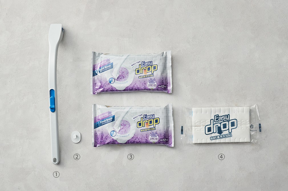 02. 변기크리너 핸들 1개 + 리필 30개입 (라벤더) ・구성 : ①핸들 1개, ②후크 1개, ③라벤더향 리필 2팩(24개입 / 12개입 X 2팩), ④체험분 1팩(6개입)