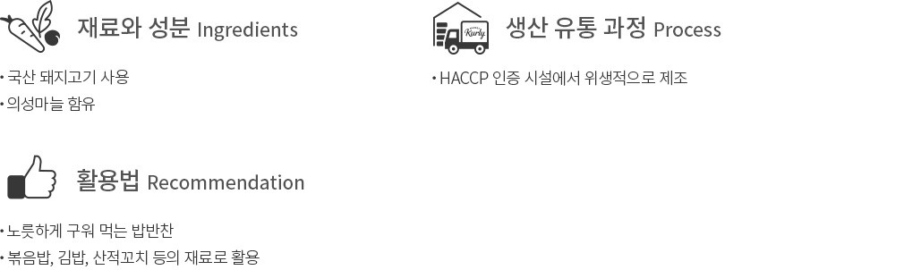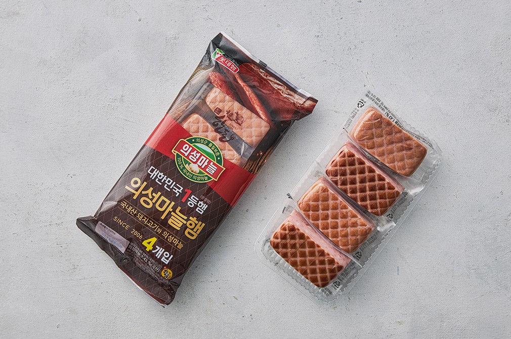 노릇하게 구운 햄 한 조각은 따끈한 밥이 절로 떠오르는 최고의 반찬이죠. 이번에 소개하는 제품은 롯데햄의 의성마늘햄이에요. 국내산 돼지고기만을 사용한 것은 물론, 의성군의 군수가 품질을 보증한 마늘을 넣어 감칠맛을 살렸는데요. 별다른 양념을 곁들이지 않아도 고소한 육즙 사이로 은은하게 올라오는 마늘의 풍미가 입맛을 돋운답니다. 한 번에 먹기 좋은 양만큼 소분한 햄 4개를 묶어 보내드리니, 한 끼에 한 개씩 꺼내 드시기 좋을 거예요.
