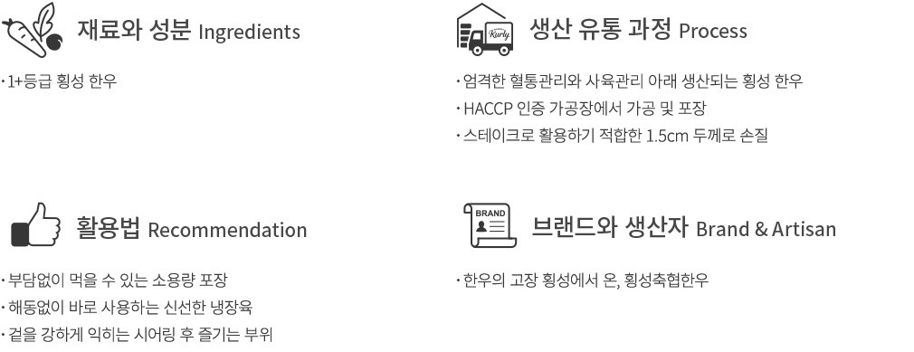 정육 상품의 특성상 3% 내외의 중량 차이가 발생할 수 있습니다. 비닐포장 등에 의해 산소가 공급되지않아 간혹 검붉게 변하는 현상이 발생할 수 있으나, 산소와 접촉하면 선홍색으로 돌아오는 점 안내드립니다.