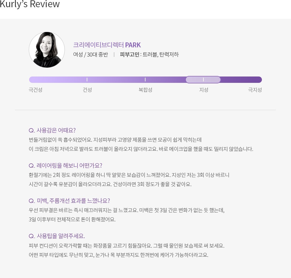 ・사용법 : 기초 케어 마지막 단계에서 고루 펴바르세요. 보통 가볍게 한 겹이면 충분해요.