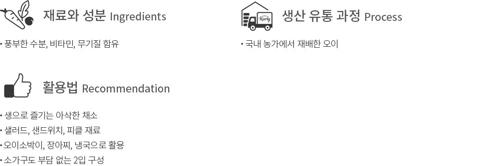 꼭지로 갈수록 짙어지는 녹색 그라데이션과 오돌토돌한 돌기가 매력적인 채소, 오이입니다. 시원하고 상쾌한 맛과 식감을 지녀 샐러드, 샌드위치 토핑부터 김밥까지 다채롭게 활용되곤 하는데요. 컬리는 국내 농가에서 유기농법으로 길러낸 제철 오이를 선보입니다. 쉽게 무르지 않아 오이소박이, 장아찌 등 밑반찬을 만들기에도 좋답니다. 1인 가구도 부담 없는 2입 구성으로 전해드릴게요. 오이 특유의 아삭한 식감, 싱그러운 수분감을 오롯이 누려보세요.