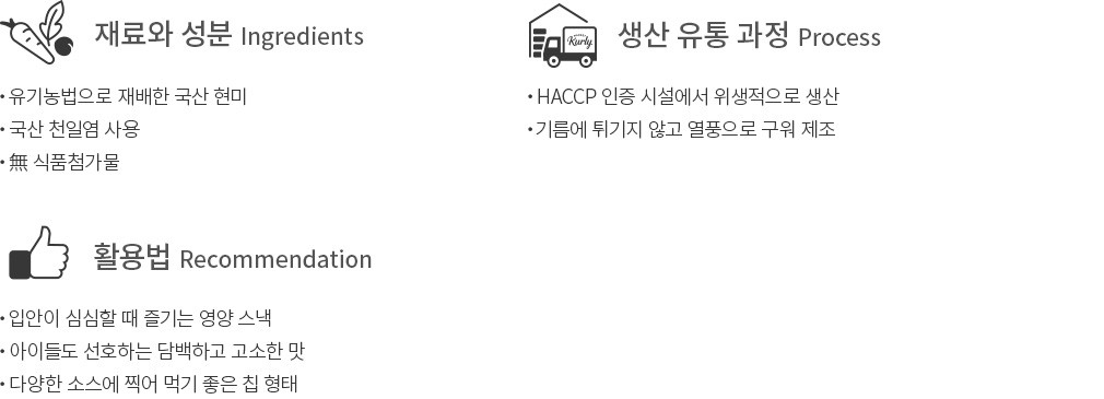 ・특징 : 유기농법으로 재배한 국산 현미를 기름에 튀기지 않고 열풍으로 구워 만든 바삭한 스낵이에요. 한 입에 쏙 들어가는 작은 크기랍니다.