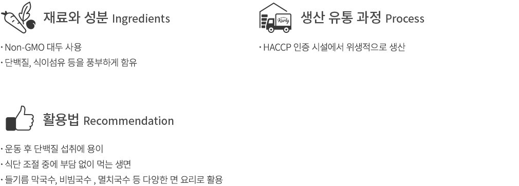 ・특징 : 100% 식물성 단백질로 만든 식단면 생면을 1인분씩 소포장하여 3덩이 보내드려요. 식감이 부드러워 들기름 막국수, 비빔국수, 멸치국수 등으로 다양하게 요리하기 좋아요.