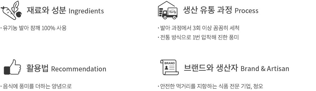 저온 로스팅으로 안심! 국산 참깨를 발아 과정 중 깨끗하게 세척하여 단 한번 착유하였기에 맛이 깊고 고소합니다