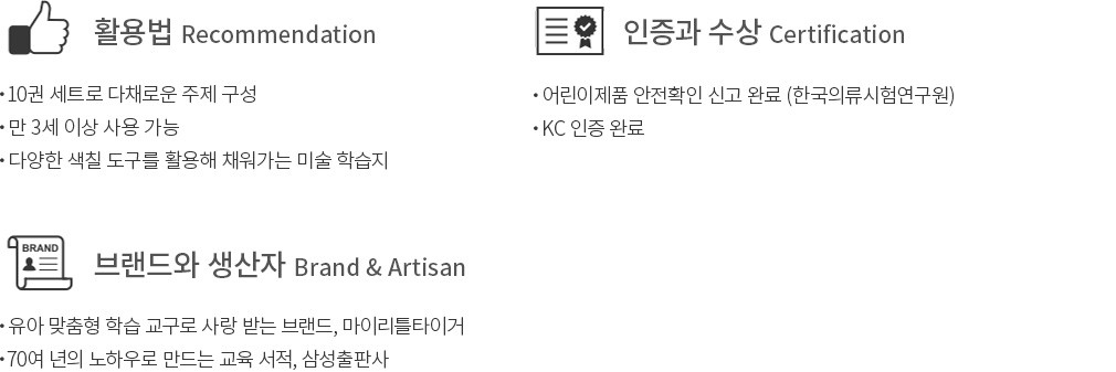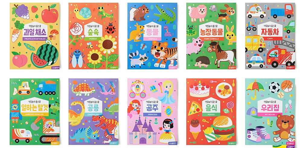 ・특징 : 과일 채소부터 우리집까지 10가지 주제가 담긴 세트예요. 권당 32페이지의 분량으로, 아이 스스로 색칠놀이책을 완성해나가며 창의력과 집중력을 키울 수 있습니다.