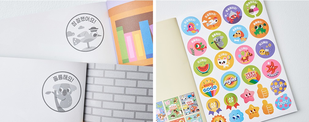 ・책 뒷면에 동봉된 스티커를 떼어 붙이며, 아이가 자신만의 작품을 완성할 때마다 칭찬해주세요.