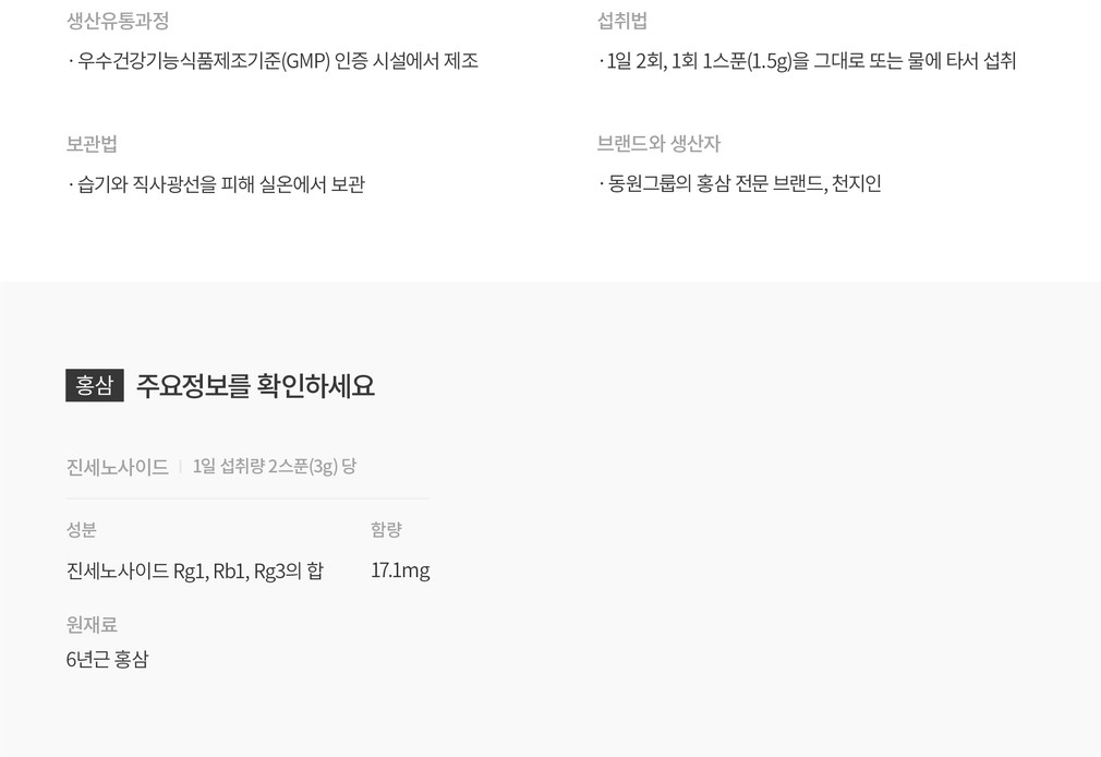 기능 정보 ・[홍삼] 먼역력 증진 · 피로개선 · 혈소판 응집억제를 통한 혈액흐름 · 기억력 개선 · 항산화에 도움을 줄 수 있음