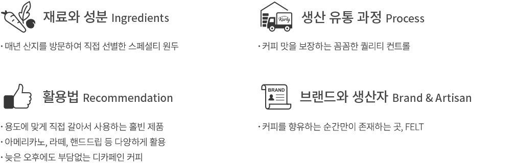 원두는 어느 정도 가스가 배출되고 난 후 향미가 더욱 선명해집니다. 원두 패키지를 열고 닫았다를 반복하게 되면 공기 중의 산소가 맛과 향을 해치는 요소가 되기도 하오니, 서늘하고 건조한 곳에 홀빈 상태로 밀봉하여 보관해주시고 개봉 후에는 가급적 빠른 시일내에 섭취하시기를 권장 드립니다. 패키지가 변경되어 변경된 패키지로 배송됩니다. 내용물 및 중량은 이전과 동일하오니 구매 시 참고 부탁드립니다.