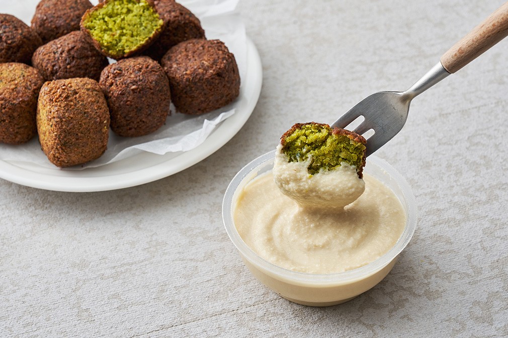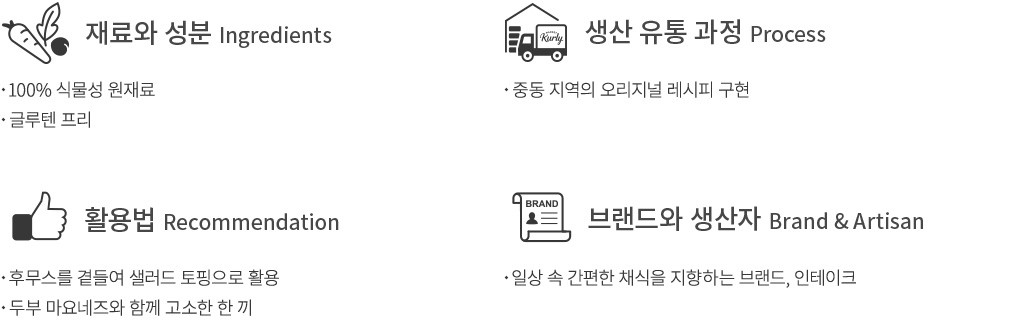 팔라펠은 병아리콩을 곱게 갈아 동그랗게 빚은 뒤 튀겨낸 중동 요리인데요. 이번에 소개하는 인테이크의 이노센트 비건 팔라펠은 엄선한 식물성 원재료를 사용한 글루텐 프리 제품이에요. 채식주의자는 물론 원재료에 민감하신 분들도 안심하고 드실 수 있죠. 고수, 큐민과 같은 향신료를 더해서 두부 마요네즈나 요거트처럼 담백한 소스와 잘 어울린답니다. 후무스*나 샐러드에 곁들이면 가벼운 한 끼 식사로도 손색 없을 거에요.