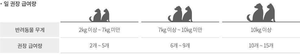 간식 급여 시 주의사항 ・반려동물의 연령, 종의 특성, 활동량에 따라 급여량을 조절해주세요.