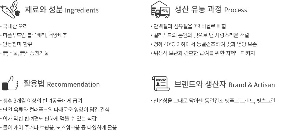 ・특징 : 오리고기에 안토시아닌을 함유한 퍼플푸드를 더한 동결건조 트릿입니다.